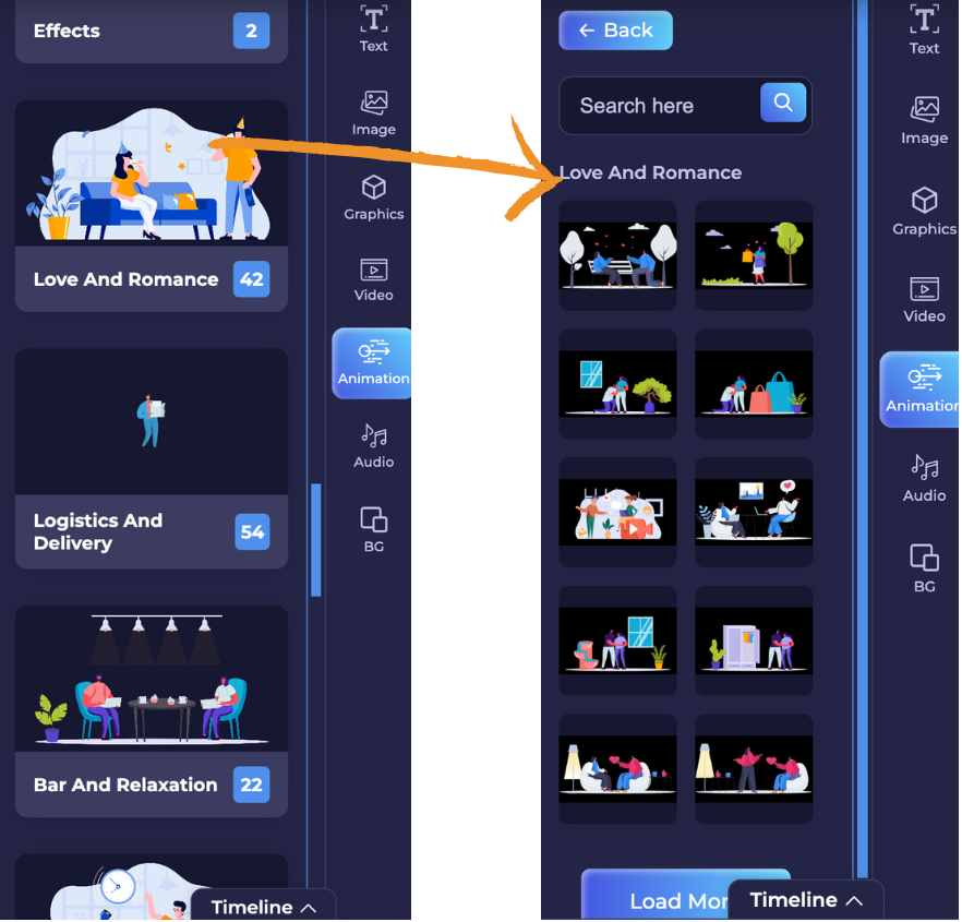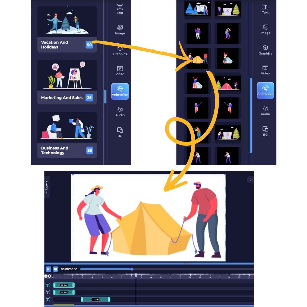 Drag and drop each animation scene into place using the drag-and-drop timeline editor. Customize your video length and add layers to the video. Add stock clips from a giant footage library, add background animation scenes, animated emojis, and anything else you like to make the video awesome.