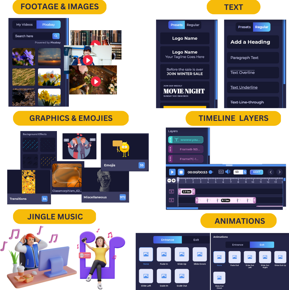 Add text, change fonts, emojis, animated scenes, animated characters, effects, and more in just a few easy clicks - no experience or special skills are needed.