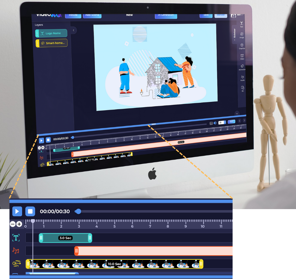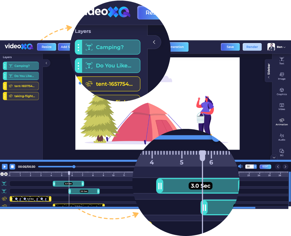 Customize your video with our easy drag-and-drop multi-timeline editor. Make elements or entire videos longer or shorter. Add or remove elements. Add layers easily by moving elements up and down.
